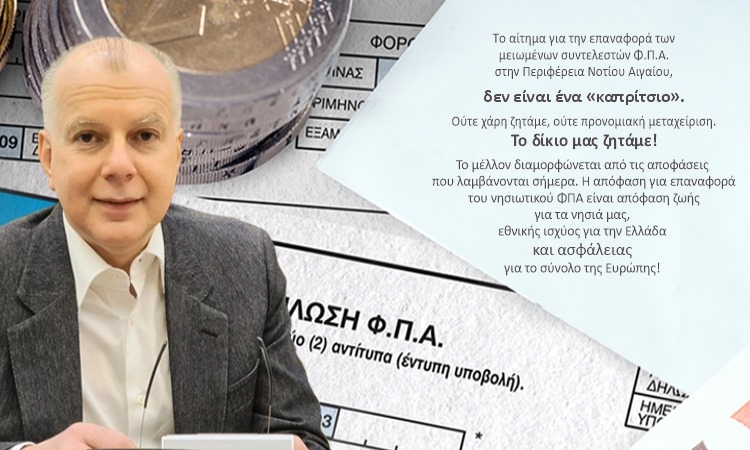 Το αίτημα για την επαναφορά των μειωμένων συντελεστών Φ.Π.Α. στην Περιφέρεια Νοτίου Αιγαίου, δεν είναι ένα «καπρίτσιο». Ούτε χάρη ζητάμε, ούτε προνομιακή μεταχείριση. Το δίκιο μας ζητάμε. Τόσο απλά και τόσο καθαρά. Ζητάμε το δίκιο που χάσαμε όταν η προηγούμενη κυβέρνηση κατήργησε τον νησιωτικό ΦΠΑ, με δική της πρόταση προς τους δανειστές στο πλαίσιο της συμφωνίας για το 3ο μνημόνιο.