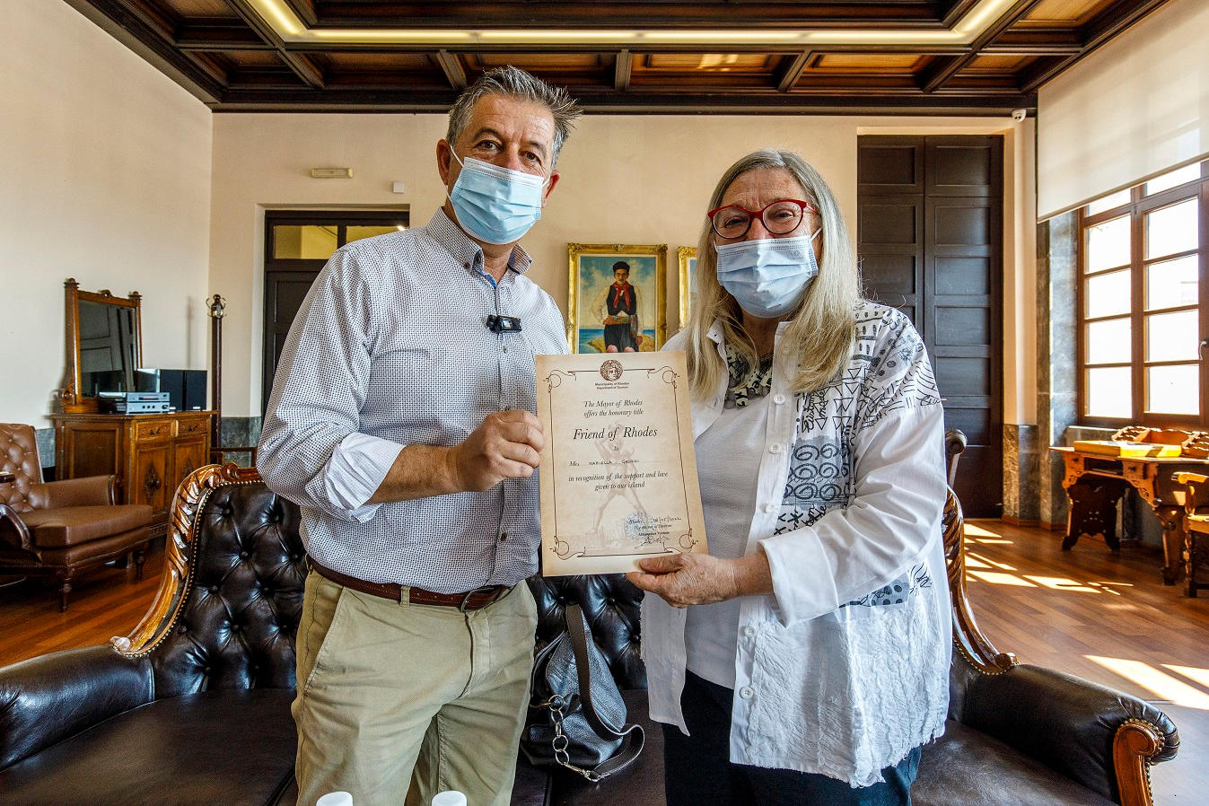 Την Ιταλίδα δημοσιογράφο και το κλιμάκιο τεχνικών που τη συνόδευε στη Ρόδο, υποδέχθηκε ο εντεταλμένος σύμβουλος Τουρισμού και Δημοσίων Σχέσεων Αθανάσιος Βυρίνης στην αίθουσα εθιμοτυπίας στο Δημαρχείο, παρέχοντας της αφενός πλούσιο ενημερωτικό υλικό που διαθέτει η Διεύθυνση Τουρισμού Δήμου Ρόδου και αφετέρου καταρτώντας από κοινού ένα πρόγραμμα επισκέψεων στα μέρη που αναζητούσε και που δεν ήταν γνωστά στο ευρύ κοινό. Επίσης την βράβευσε ως φίλη της Ρόδου καθώς επισκέπτεται το νησί μας για περισσότερα από 23 έτη, ενώ την Mariella Grossi συνόδευε η Ροδίτισσα επιχειρηματίας και φίλη της, Έφη Δέδε.