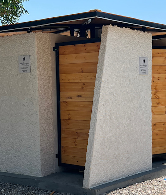 Δόθηκε επίσης προτεραιότητα στην εξοικονόμηση νερού με την ενσωμάτωση ειδικής τεχνολογίας (μπουτόν ελεγχόμενης ροής) στις ντουζιέρες. Αξίζει να σημειωθεί, ότι οι νέοι οικίσκοι αποδυτηρίων και ντους που σπάνια συναντώνται σε δημόσιες παραλίες στην Ελλάδα και στο εξωτερικό, επιτρέπουν λόγω της ιδιαίτερης χωροταξίας τους την ιδιωτικότητα, ενώ εξυπηρετούν και την οικογενειακή χρήση. Σημειώνεται τέλος, ότι έχουν προβλεφθεί και οικίσκοι, ειδικά προσαρμοσμένοι για ΑμεΑ.