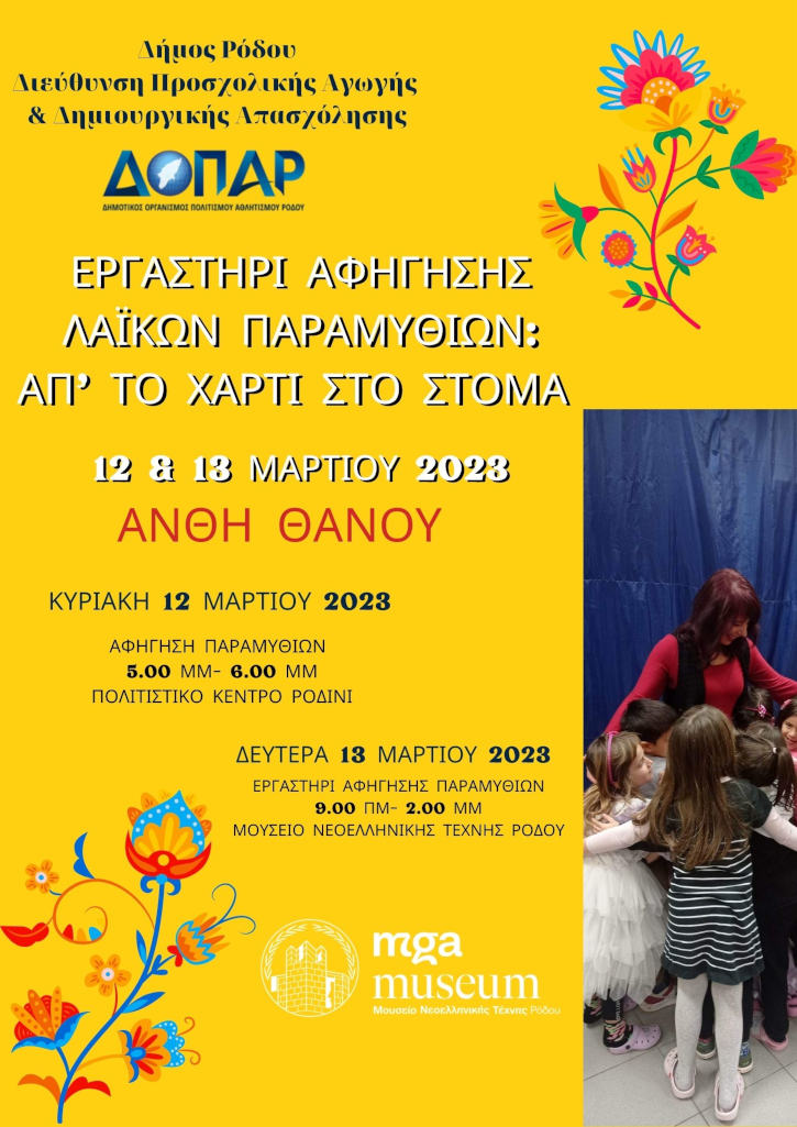 Την Δευτέρα 13 Μαρτίου διοργανώνεται στη νέα Πτέρυγα του Μουσείου Νεοελληνικής Τέχνης (ώρα 9.00 π.μ. – 2.00 μ.μ.), επιμορφωτική, εργαστηριακή ημερίδα για τις/τους παιδαγωγούς που απασχολούνται στους βρεφονηπιακούς σταθμούς του Δήμου της Ρόδου με προσκεκλημένες ομιλήτριες την κυρία Μαρία Αργυρίου & την κυρία Δέσποινα Χατζηδιάκου από το Τ.Ε.Π.Α.Ε.Σ του Πανεπιστημίου Αιγαίου. «Η φιλοσοφία της Διά Βίου Εκπαίδευσης Παιδαγωγών της Προσχολικής Αγωγής με προτεραιότητα τις Τέχνες. Διεθνείς Πρακτικές», είναι ο τίτλος της ομιλίας τους, ενώ στο πλαίσιο της επιμορφωτικής ημερίδας θα πραγματοποιηθεί και Εργαστήρι Αφήγησης Λαϊκών Παραμυθιών.