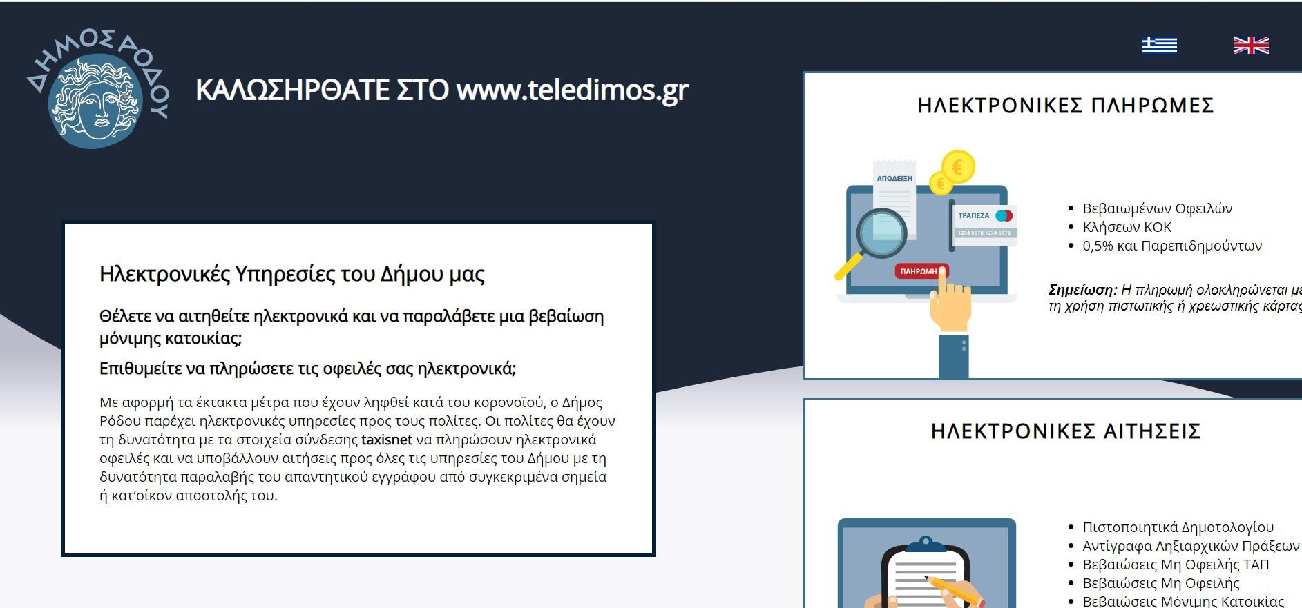 «Η ανάπτυξη της ηλεκτρονικής διακυβέρνησης αποτελεί σημαντική προτεραιότητα για τη Δημοτική Αρχή του Αντώνη Καμπουράκη. Μέσω της πλατφόρμας teledimos.gr, δίνεται η δυνατότητα στον πολίτη να διεκπεραιώνει μία σειρά από συναλλαγές με το δήμο Ρόδου, όπως είναι η πληρωμή του τέλους 0,5% – Παρεπιδημούντων χωρίς γραφειοκρατία και χωρίς αναμονή.