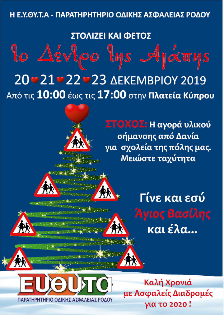 Το « Δέντρο της ΑΓΑΠΗΣ» Εκατοντάδες μπάλες με αγάπη θα στολίσουν για 11η χρονιά το « Δέντρο της ΑΓΑΠΗΣ», το «Δέντρο της ΕΥΘΥΤΑ», στην πλατεία Κύπρου 20-21-22 & 23 Δεκεμβρίου 2019 από τις 10:00 έως τις 17:00.